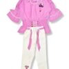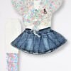 This trendy 3-piece girls’ dress set features a colorful alphabet-print top with flutter sleeves, a stylish denim pleated skirt, and comfortable printed leggings. A perfect blend of fun, fashion, and comfort.