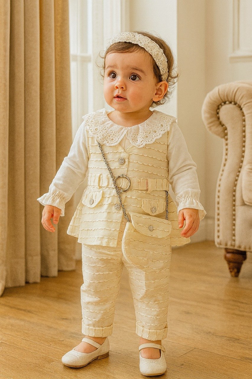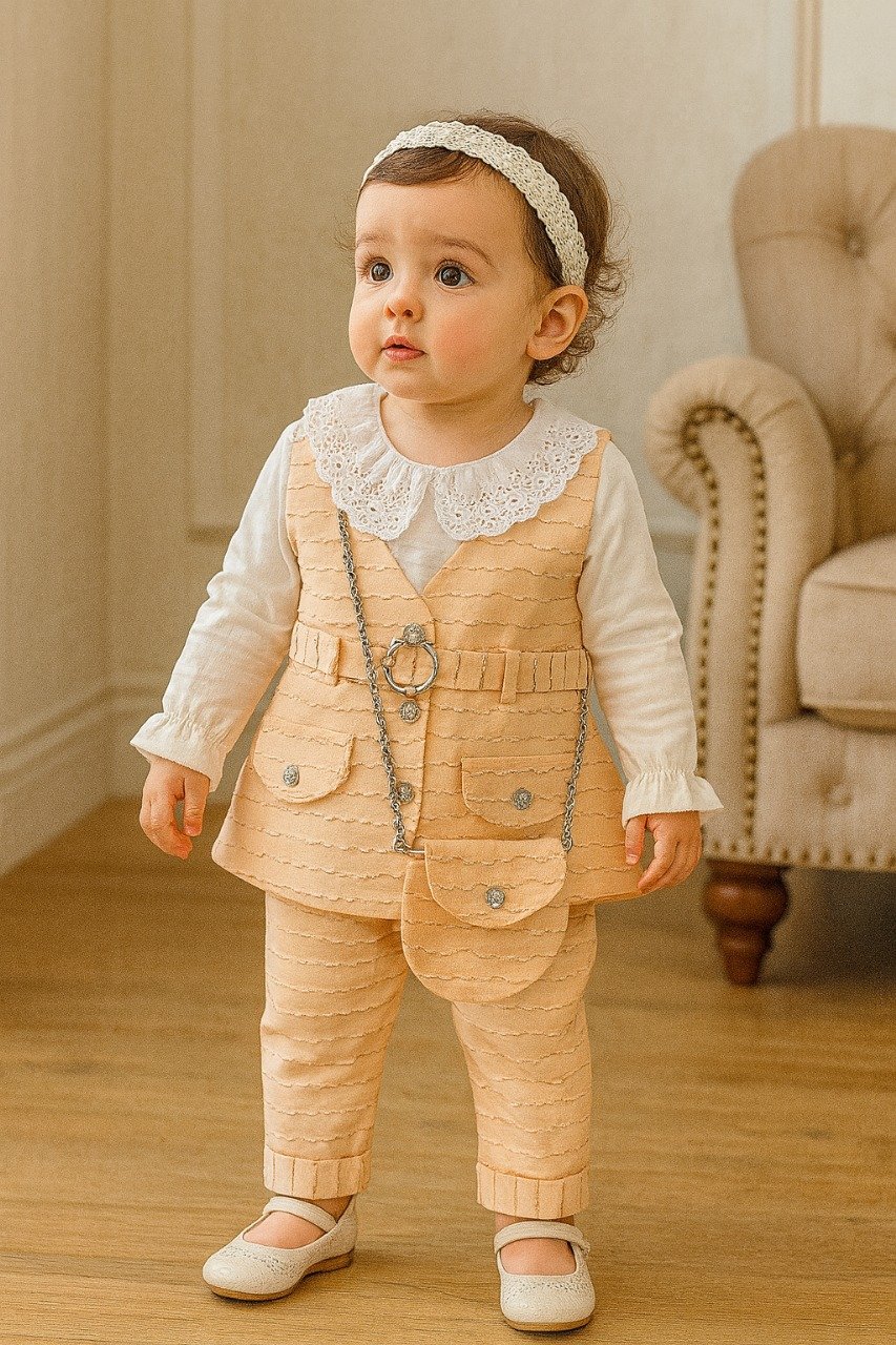 Adorable baby girl dress paired with a cute chain purse — a stylish and charming outfit for parties and special occasions.