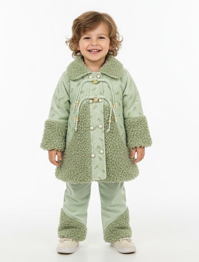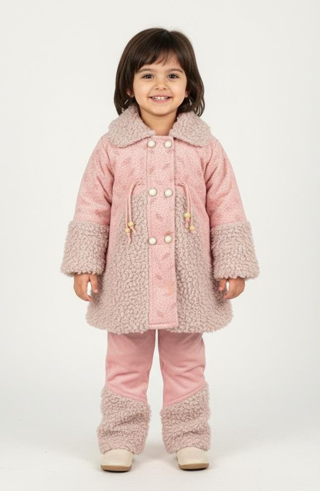 Stylish baby girl winter suit with sherpa coat and matching trousers — warm, cozy, and fashionably designed for chilly days.