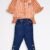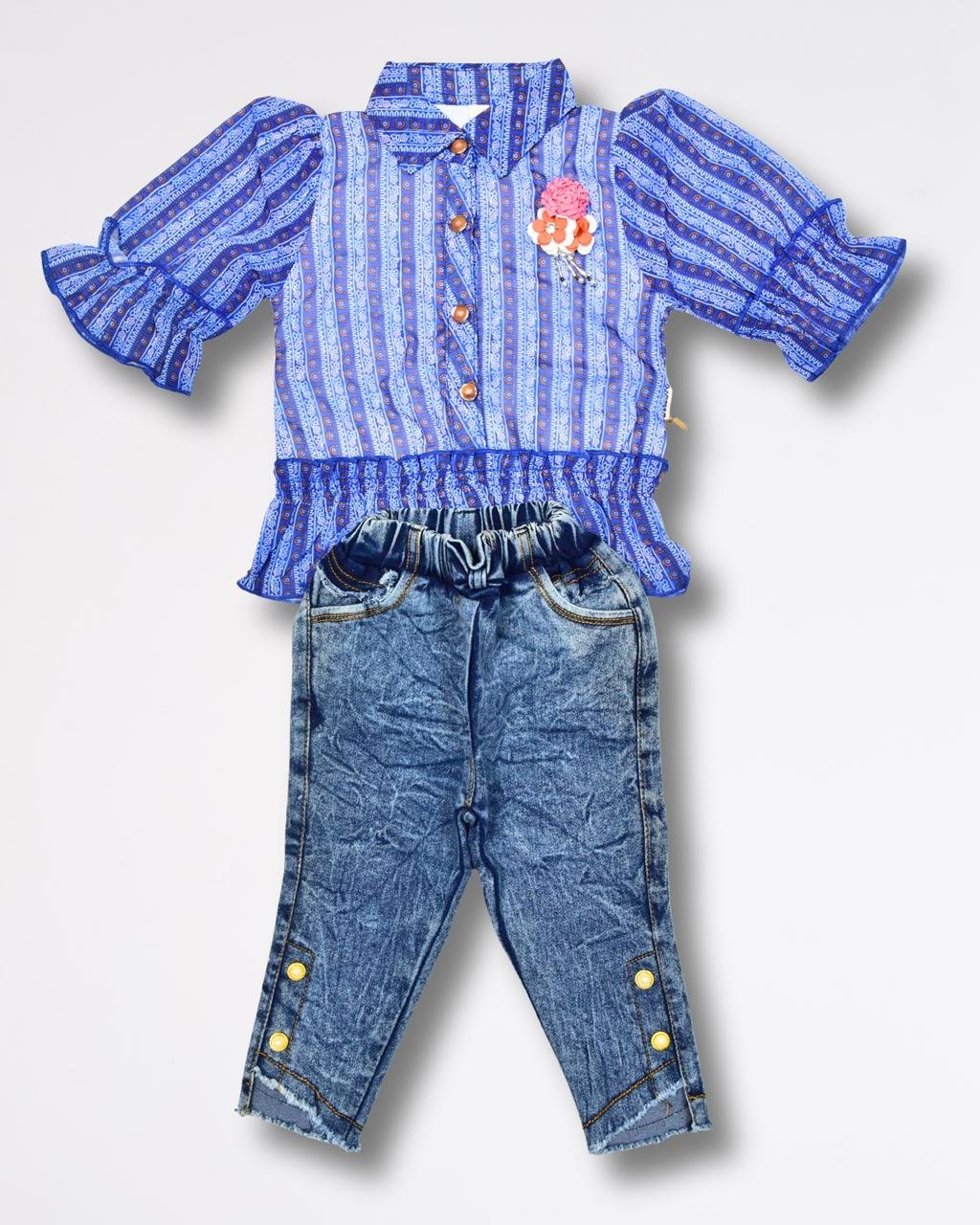 This stylish girls’ 2-piece outfit features a beautifully printed top paired with trendy denim pants. The top is designed with a shirt-style collar, front button detailing, and puffed sleeves, giving it a modern and fashionable look. A cute floral embellishment on the front adds a charming touch, while the elasticated waist creates a flattering fit. The soft denim pants come with an elastic waistband and button detailing at the hem for added style and comfort.